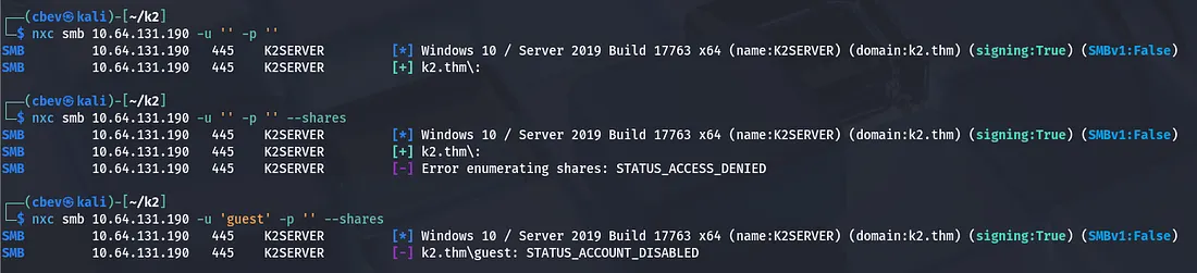 Service detection performed. Please report any incorrect results at https://nmap.org/submit/ . Nmap done: 1 IP address (1 host up) scanned in 54.70 seconds Looks to be another Windows AD environment with almost the exact same setup. The server gives us a FQDN of K2RootDC.k2.thm and another domain of k2.thm . Let’s see if we can root this domain controller!