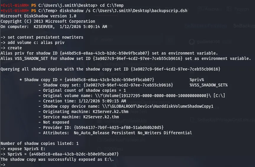 Then I make a C:\Temp directory and execute diskshadow on the script I uploaded inside of it.