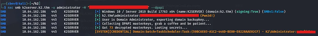 I also use this hash to authenticate on SMB and grab the plaintext password for admin as we may need it for The Summit. The–dpapi option dumps all DPAPI credentials using netxec which grants us admin creds.