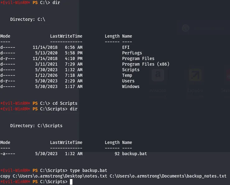I do some more digging on the system and find an unusual directory in the C:\ drive. There is a batch script which gets used to back up a notes file in o.armstrong’s Desktop into his Documents folder.