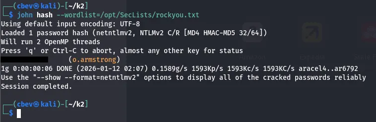 I send that hash over to JTR in hopes of cracking it with rockyou.txt.