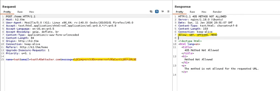 I begin testing for injection vulnerabilities and XSS but find that the default request to the contact form is not allowed.