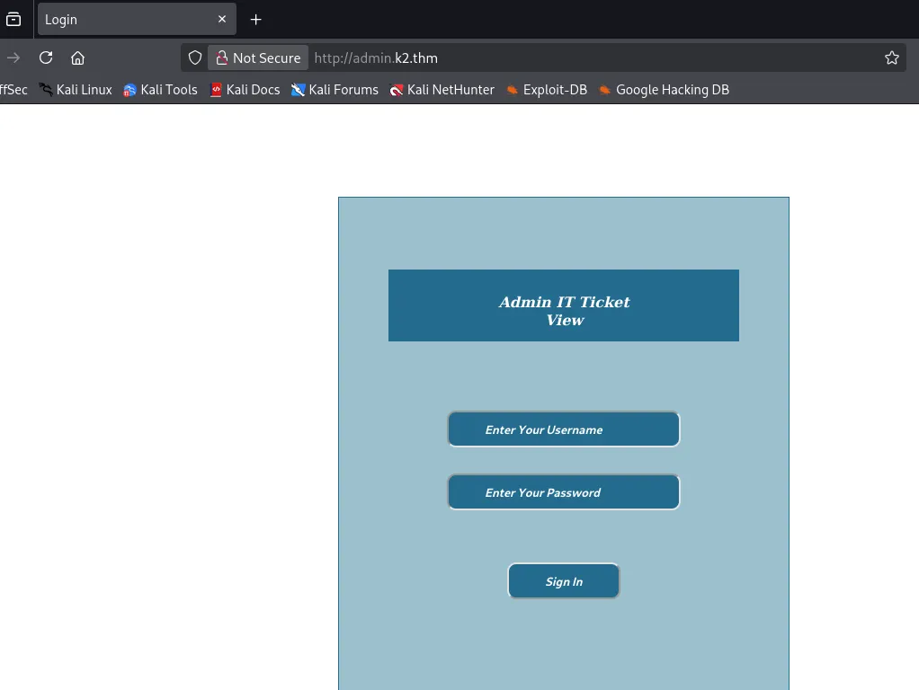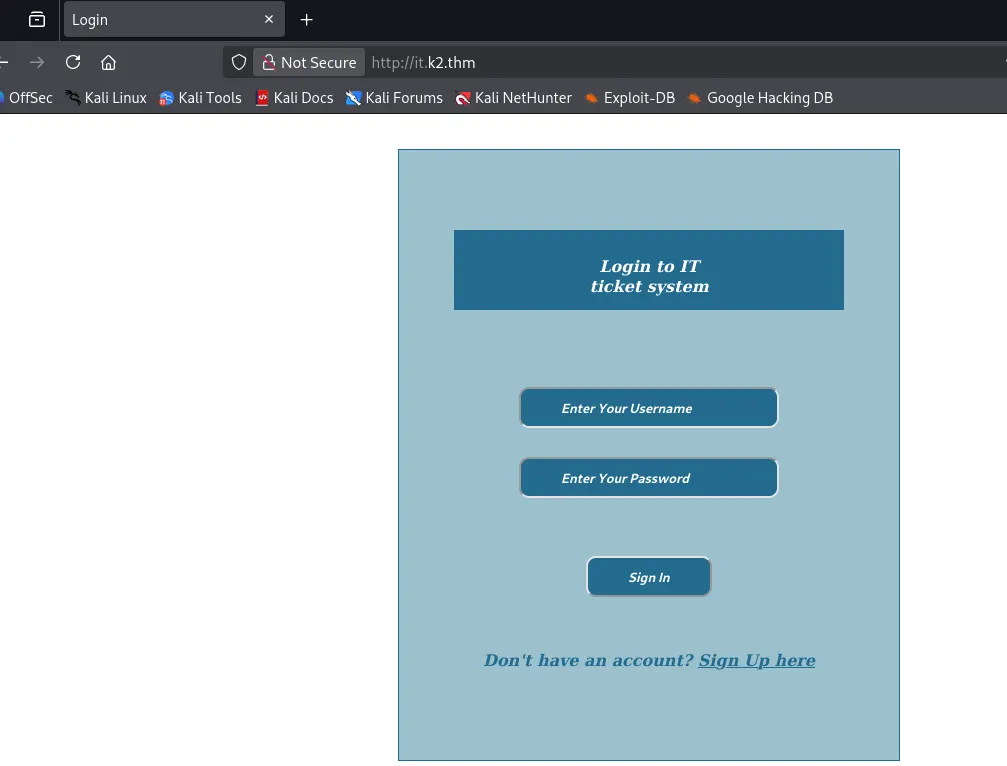 I add those to my /etc/hosts file as well and start enumeration on them. it.k2.thm looks to be a way to log into the ticketing system via username and password. We can also create our own account to search internally.