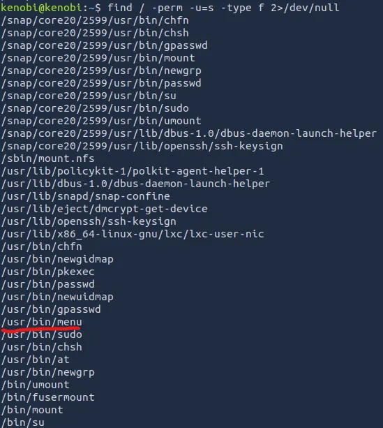 Using common privilege escalation methods, I find a SUID bit set on a strange binary named ‘menu’.