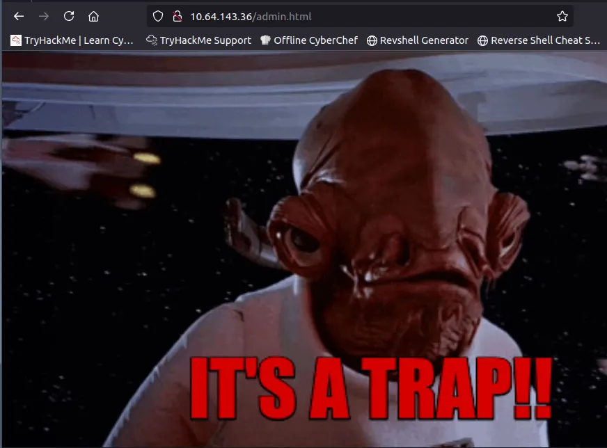 Before we checking out Samba shares, I had a look at the web page and fuzzed it for endpoints. Only thing I found was a gif saying it was a trap (rabbit hole).