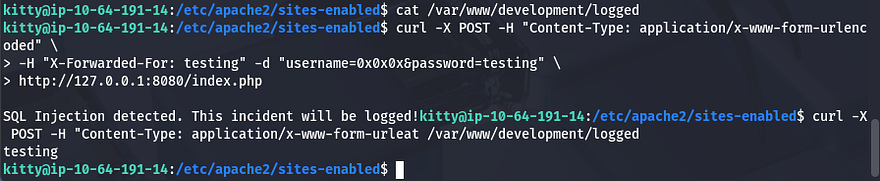 If the server detects one of the evil characters listed, then it parses the request sent and stores the X_Forwarded_For header in the $IP variable which gets sent to /var/www/development/logged to be used in the previous script. A bit of messing around with that header in a few POST requests returns nothing.