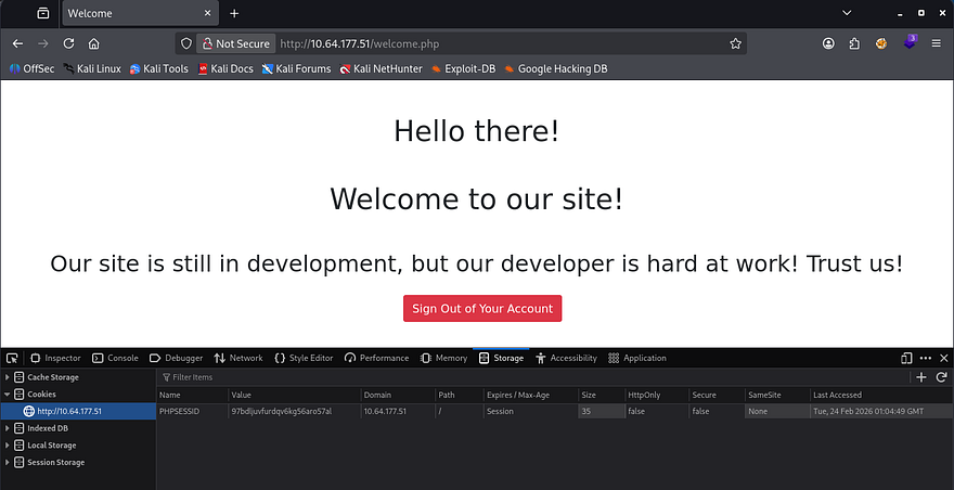 There’s not much to do once we’re in except log out and our name doesn’t get reflected anywhere, so vulnerabilities like SSTI or Second-Order SQL Injection can be ruled out. Curious as to how the site tracks our login, I check my browser’s local storage to find a PHPSESSID cookie with the httponly flag set to false. That means if we find any form that gets reflected to another user, we may be able to hijack their sessions with a Cross-Site Scripting payload.
