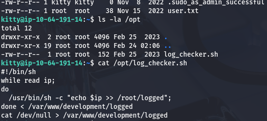 If we display the contents of /var/www/development/logged, it is empty which either means that this script is being executed regularly or the site isn’t properly logging stuff. I’m going to guess the former, but uploading a tool like pspy will confirm that root user has a cronjob running this every minute or so.