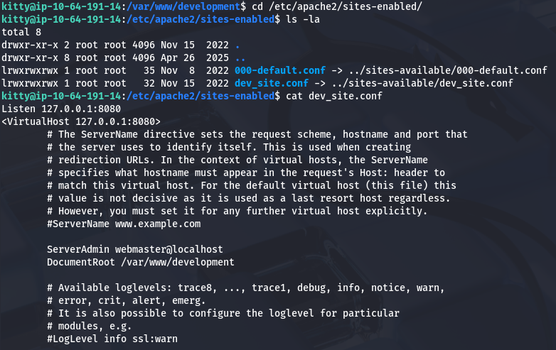 I was confident that my payloads were functional so I searched for any other web servers that may be running on the box. As suspected, there were two config files inside of /etc/apache2/sites-enabled/ and printing the dev_site one showed a server running internally on port 8080 that also contains a matching DocumentRoot value to root user’s script.