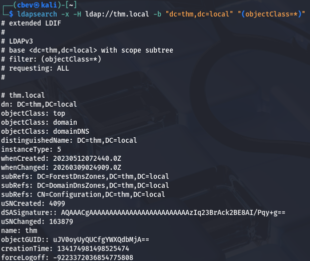 This box is rated hard difficulty on THM. It involves us finding default credentials for domain users through LDAP anonymous binds and abusing a misconfiguration in Active Directory Certificate Services to escalate privileges to administrator by UPN impersonation in a vulnerable template.