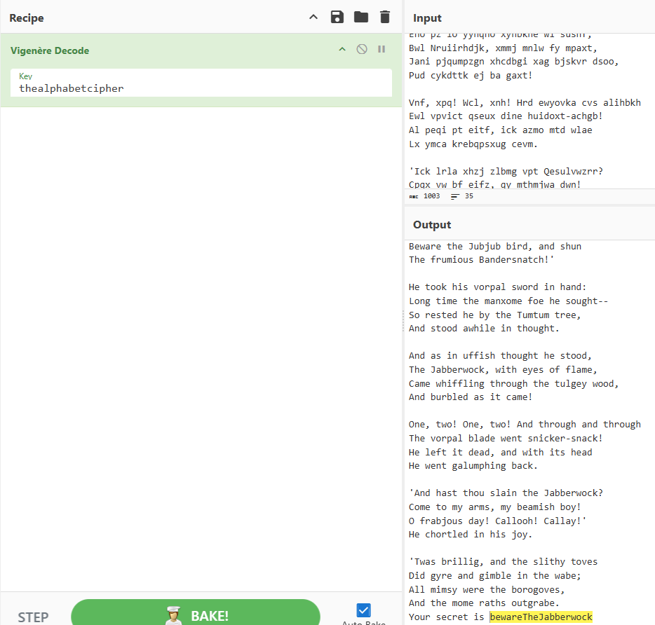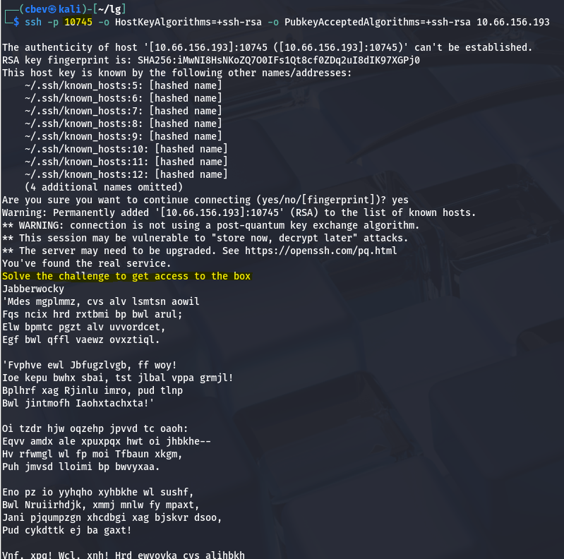 Seems like we need to solve a challenge to presumably gain access on port 22. This ciphertext is an encoded form of the famous poem “Jabberwocky”, I thought it was a Rot algorithm at first but since each letter is altered individually, it had to be a Vigenère cipher.