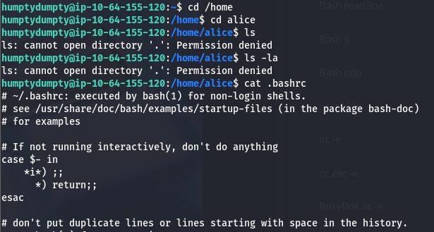 I was a bit stuck at this point until trying to her .bashrc file to check if we actually didn’t have perms over it. For some reason, it blocks us from listing them but reading them directly works.