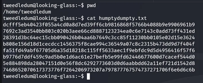 Here we see a file named humptydumpty.txt which contains a list of hashes. Cracking them gives us 6 potential passwords, however none of them work. I found it strange that the last line didn’t decode so I sent it to CyberChef and discovered that it was his password hex encoded.