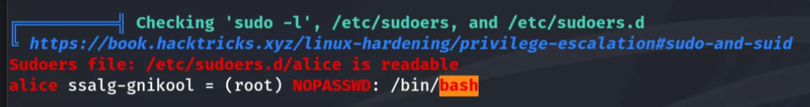 Eventually, I checked the /etc/sudoers.d/ files and found that Alice actually had access to run sudo /bin/bash on the system, but we had to specify a hostname of ssalg-gnikool for it to run. That will spawn a root shell and we can grab the final flag under the root dir.