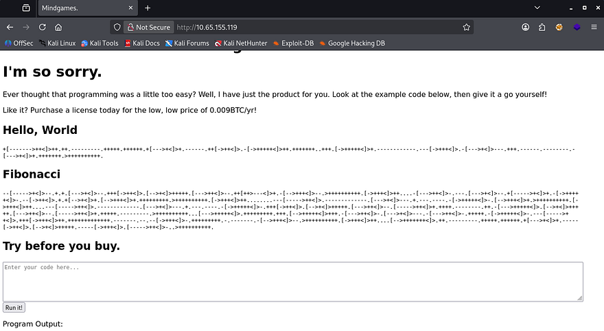 It truly is meant to be very hard to manually code in, on the other hand the original compiler size was only 240 bytes. On the site are a few test commands that we can use to confirm the language is actually being used here. There is also a function to test run code written in the language, which is likely what we need to exploit.