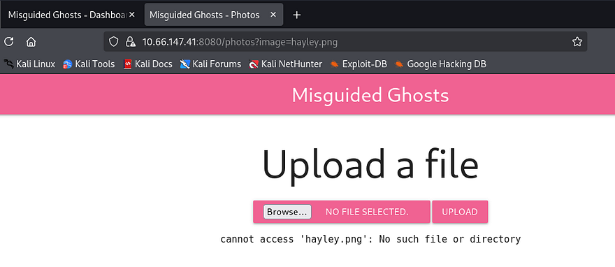 I discover the /photos endpoint, which allows for file uploads to the website. Checking to see if a safe file is allowed for any filters in place returns a strange error that it cannot be found. It looks like this upload function is used to pull files from the web server and put them into a photos directory that the site will grab from.