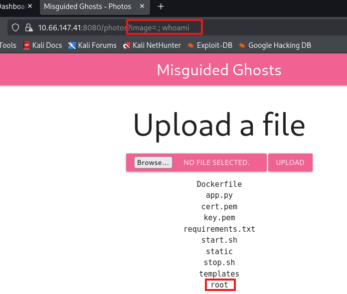 Appending a semicolon with a simple command like whoami confirms that we actually have RCE on the box and that the server is running as root user. Also, the existence of a Dockerfile almost certainly means the site is hosted in a Docker container.