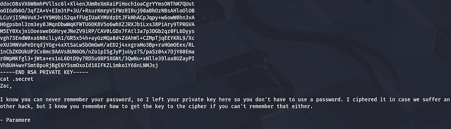 Now that we have a shell on the box, it’s time to escape the docker container. A bit of internal enumeration shows a few very sensitive files inside a notes folder in Zac’s home directory. The first is an RSA private key to login on the box via SSH, and the other is a message denoting that they have ciphered the file using a key (most likely using a Vigenère cipher).