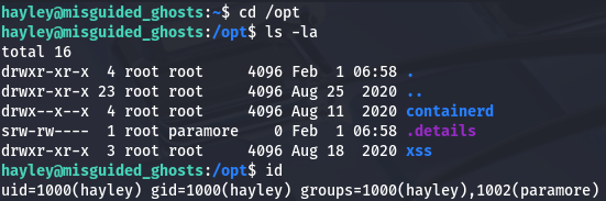 I figured a shell that’s already running as root user would be a pretty easy target if not configured correctly. Checking the permissions on that .details socket shows that everyone in the paramore group has the ability to read/write to it.