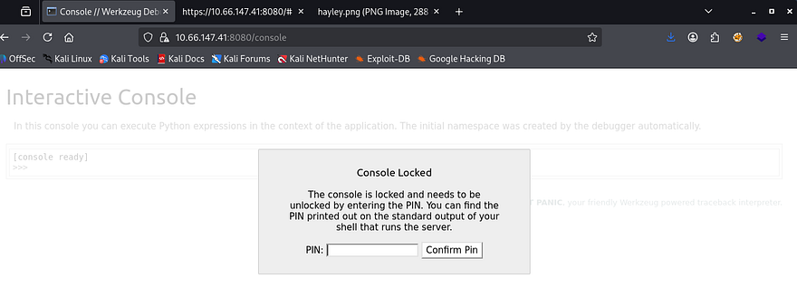 This returns a few interesting hits, the first being a interactive console page that allows for Python expressions to be ran remotely, however it is PIN protected so I move on for now. It’s a bit hard to see but the warning shows that this page discloses that the site is utilizing Werkzeug as its uWSGI; that’s great info as now we know to exploit Python payloads in the coming steps.