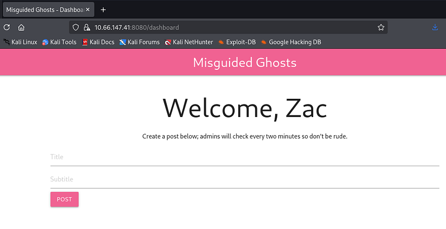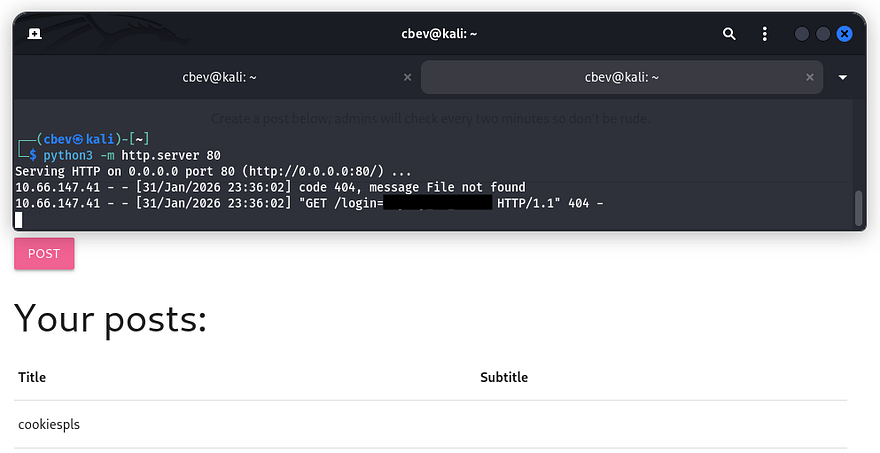 It allows for users to post to the landing page in order for others to see. The message also notes that an admin will check every so often to moderate content on the site. I also discover that the server gives us a login cookie with the HttpOnly option set to false.