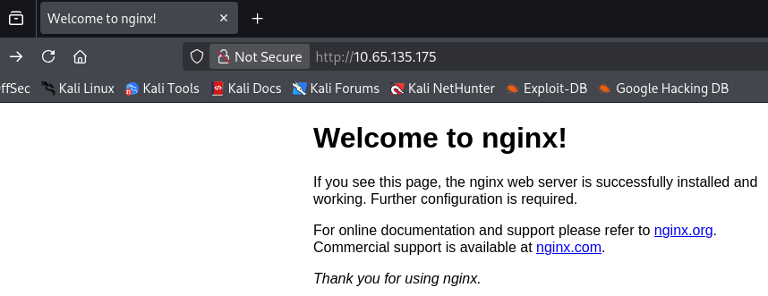 Not too much we can do on SSH without credentials so I fire up Gobuster to find subdirectories/subdomains in the background before heading over to the webpage. It looks like the standard welcome text for a fresh nginx install, so enumeration will be key on this box as we don’t have anything to exploit yet.