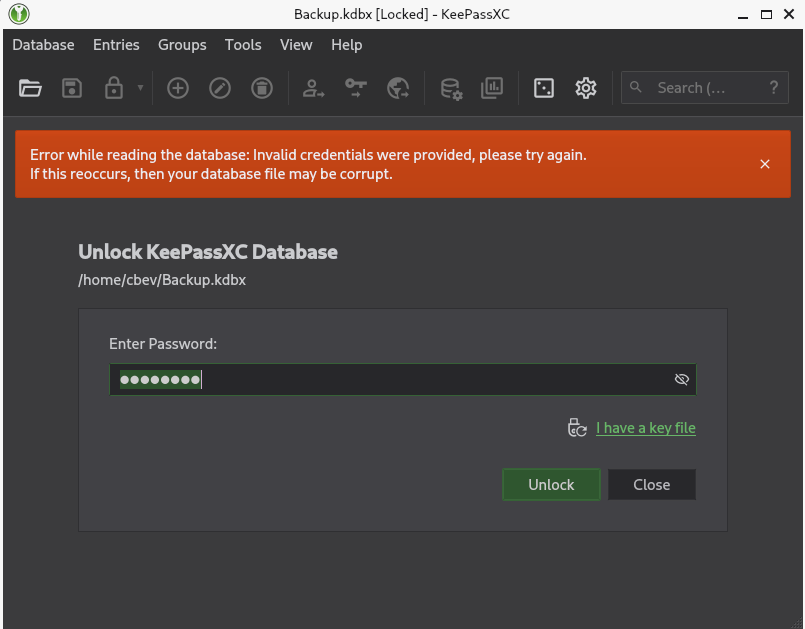 Opening this with the Keepassxc tool shows that it’s password locked.