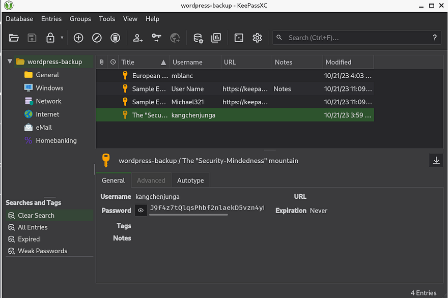 That gives us the correct password for the backup file and we can now dump the database. Doing so rewards us with kangchenjunga’s password.