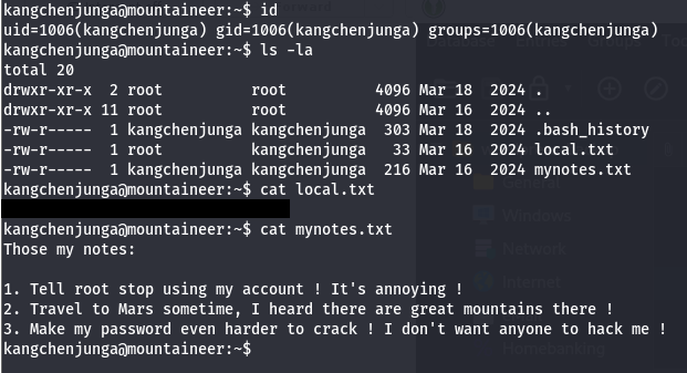 Logically, we’d need to pivot to Kangchenjunga’s account since they have the local flag in their home directory. The only thing to exploit was that KeePass file which I end up sending to my attacking machine to investigate.