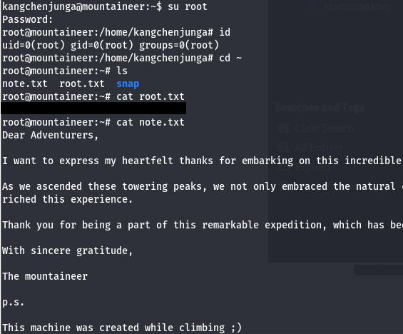 Finally, I switch users to root and grab the final flag inside /root directory to finish out the challenge. There’s also a note from the box’s developer which I recommend reading.