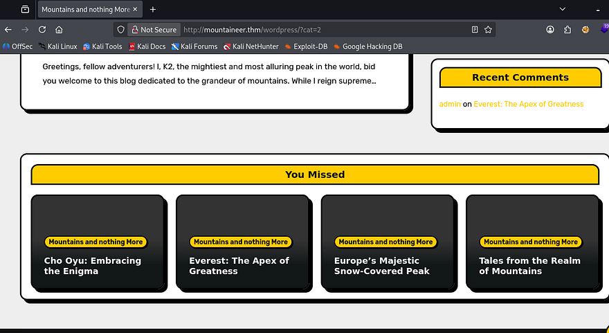 My directory search finds a page that redirects us to an application built on Wordpress. I should mention that I had to add mountaineer.thm to my /etc/hosts file for the page to load properly even though the scope did not provide it. This site it a dedicated blog for different mountains to post about themselves, taking some time to look around the site gives us a few usernames of Cho0yu, MontBlanc, Everest, and Admin.